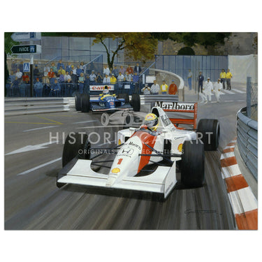 Signed edition print. Ayrton Senna holds off Nigel Mansell’s fast closing Williams during the closing laps of the 1992 Monaco Grand Prix, to take victory in his McLaren.