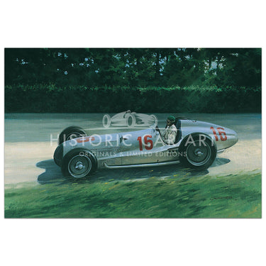 Limited edition print. Dick Seaman enters the Karussell turn in his 3-litre supercharged Mercedes-Benz on his way to a magnificent, if unexpected, victory in the 1938 German Grand Prix at the Nürburgring.