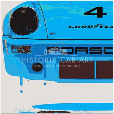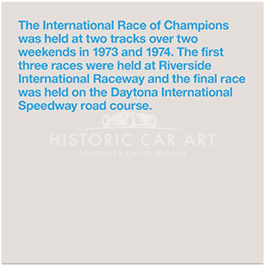 A contemporary art poster featuring the bright blue Porsche RSR of George Follmer as raced in the 1973 & 1974 International Race of Champions. He came fifth in the Championship.