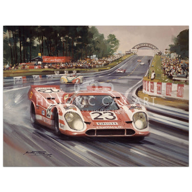 The Le Mans 24 Hours 1970 race winning Porsche 917 of Hans Herrman and Richard Attwood splashes through the Esses in this art print by Michael Turner