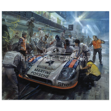 Limited edition print. A night-time pitstop for Jacky Ickx and the winning Porsche 936 during the 1977 Le Mans 24-hours.