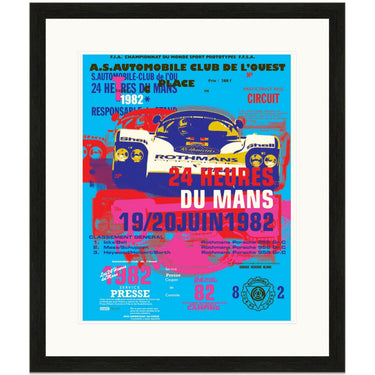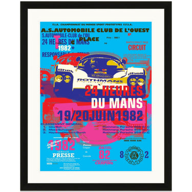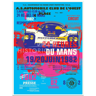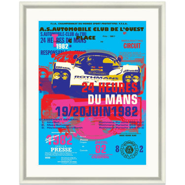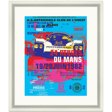 Rothmans Porsche 956 won all 3 podium places at the Le Mans 24 Hours in 1982. Portrait version, blue and pink celebration poster.
