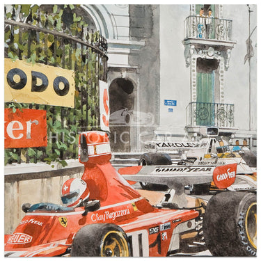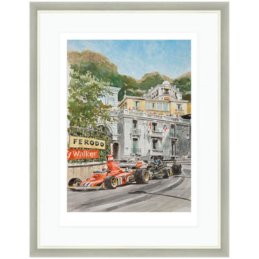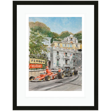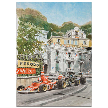 A beautiful limited edition print of the Ferrari of 4th placed Clay Regazzoni leading the Lotus-Ford of Jacky Ickx around Mirabeau during the 1974 Monaco Grand Prix.