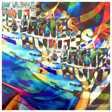 Over time, Barber has developed a collection of artwork of classic and contemporary cars. He creates the artworks as digital images, drawing and painting by hand on a tablet or screen before having a single large scale version printed onto a brushed aluminium panel.