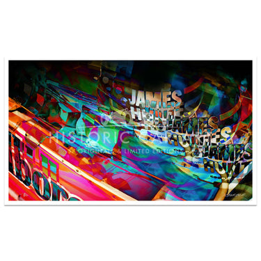 James Hunt and his Formula 1 world championship winning McLaren M23. A semi-abstract artwork.