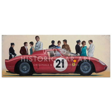 Limited Edition Print. An imagined scene in the pits at Le Mans in 1965. Jochen Rindt and Maston Gregory mix with crowd that surrounds their Ferrari 250LM before the race.