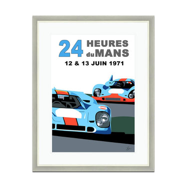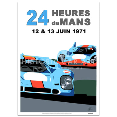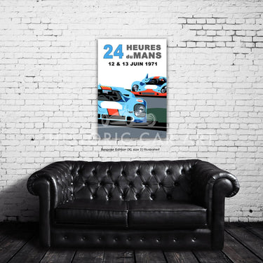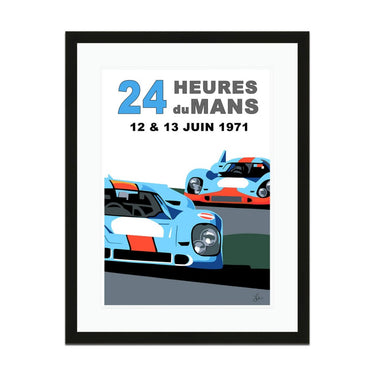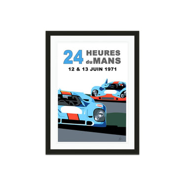 A contemporary poster designed to pay homage to the original race posters of the period. With artwork by Joel Clark celebrating Porsche at the 1971 Le Mans 24 hours. The Gulf Porsche 917K of Richard Attwood and Herbert Muller finished second to the Porsche 917K of Helmut Marko and Gijs van Lennep.