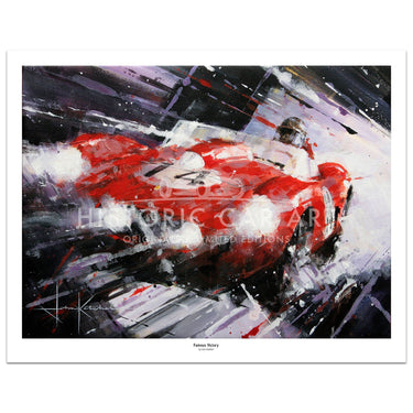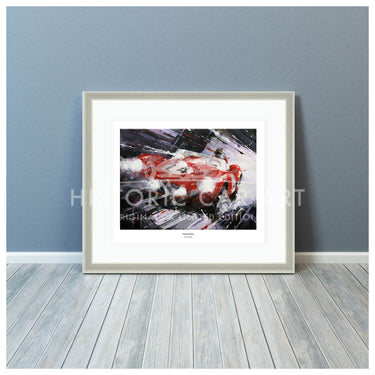 Limited Edition Print. Le Mans 1958 - Phil Hill, together with Olivier Gendebien, is the first American to win the 24hr. race in monsoon conditions with the works 3 litre Ferrari 250 TR58.