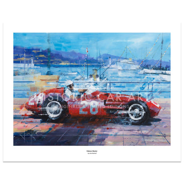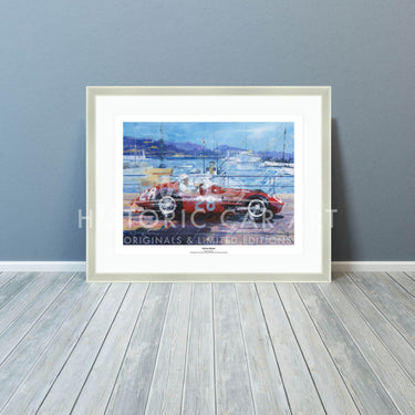 Art print by John Ketchell. Monaco Grand Prix 1956 and the winning Maserati 250F of Stirling Moss. Moss beat the Ferrari of Fangio by over 6 seconds.