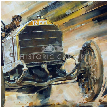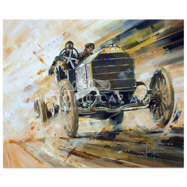 A classic dynamic artwork by John Ketchell featuring the 1903 La Turbie Hill Climb winning Mercedes 60hp Simplex driven by Otto Hieronymus.