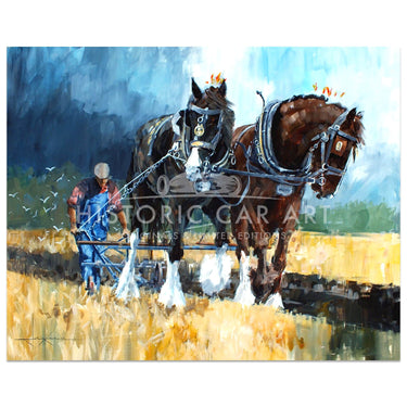 Dynamic contemporary painting of working horses pulling a plough in a field in the Cotswolds in 1988.