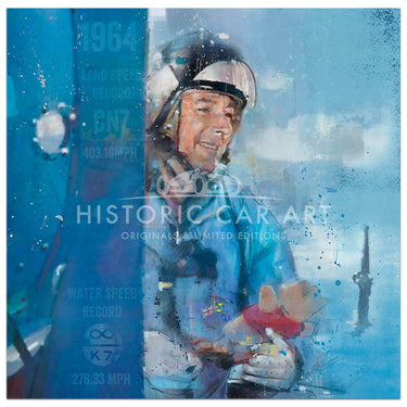 This accomplished mixed media artwork by Joff Carter is a portrait of Donald Campbell in the Bluebird CN7, clutching his lucky mascot Mr Whoppit. This piece celebrates Donald’s famous 1964 achievement, becoming the first (and so far only) person to set both the land and water speed record in the same year. In July, Campbell took the CN7 to Lake Eyre in Australia where he broke the land speed record, clocking 403.10 mph. Then came his seventh water speed record, this time at Western Australia’s Lake Dumbleyung in the Bluebird K7. With a speed of 276.33 mph, Donald clinched his iconic double on the very last day of the year.