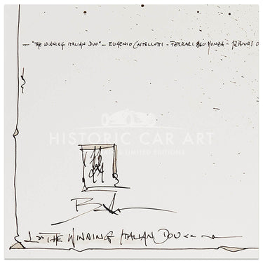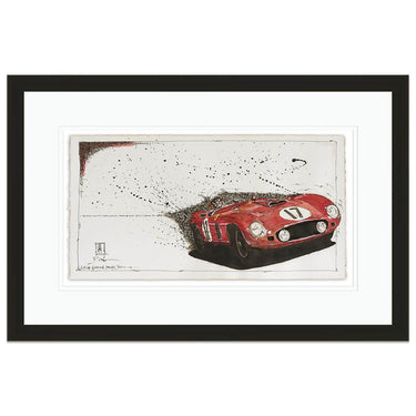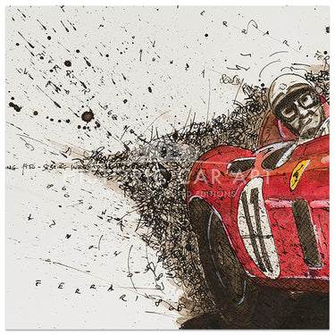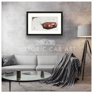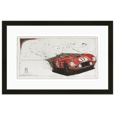 An art print from an original ink drawing of the 1956 Sebring 12h endurance race winner, the Ferrari 860 Monza Spider, driven by Fangio and Castellotti.