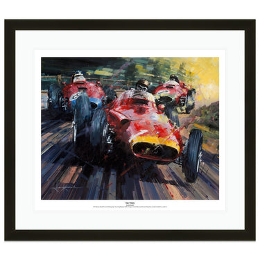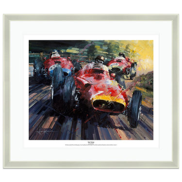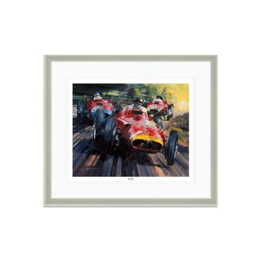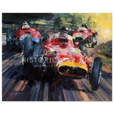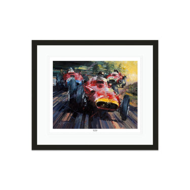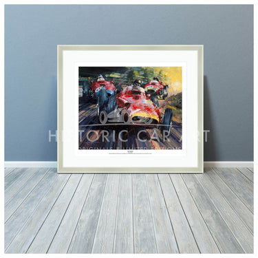 Limited Edition Print. 1957 German Grand Prix at the Nürburgring - the winning Maserati 250F of Fangio in front of the Lancia/Ferrari of Hawthorn, number 8 and Collins, number 7.