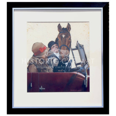 Original Painting. Two friends meet on the road in the 1920s. One with her horse and one in her Lagonda 14/60 Tourer, her dog meanwhile tries to ignore the curious horse.