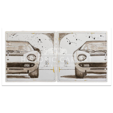 An double image art print of a Lamborghini Miura, from an original ink drawing.