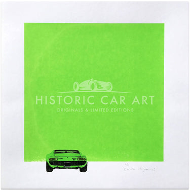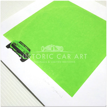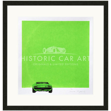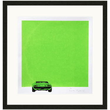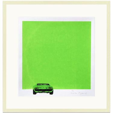 Lamborghini Miura in green hand pulled screen print by artist Kate Alger. Created by hand using old-fashioned labour-intensive techniques, skills and tools. Kate’s artwork balances her detailed hand-drawings with strong yet minimalistic compositions through her use of negative space.