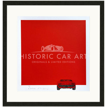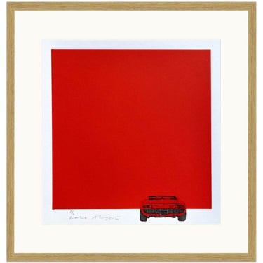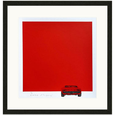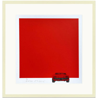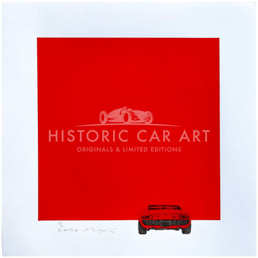 Lamborghini Miura in red hand pulled screen print by artist Kate Alger. Created by hand using old-fashioned labour-intensive techniques, skills and tools. Kate’s artwork balances her detailed hand-drawings with strong yet minimalistic compositions through her use of negative space.