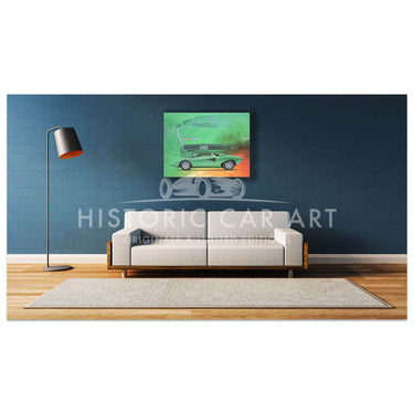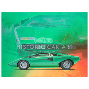 An original contemporary painting of the 1974 Lamborghini Countach LP400 Periscopio in Verde Medio by Simon Britnell.