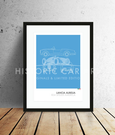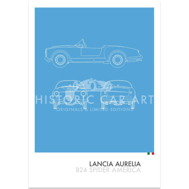 A lovely simple outline graphic poster of the 1955 Lancia Aurelia B24 Spider America. Artwork by technical illustrator William McElhinney.