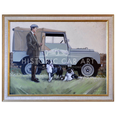 A young shepherd, in his leather gaiters, arrives for a day's work in 1950 with his border collies and Series One Landrover. A beautiful original painting by Roy Putt.