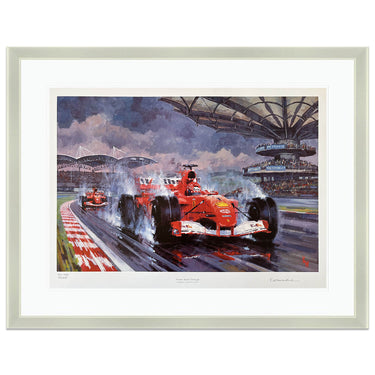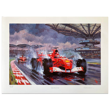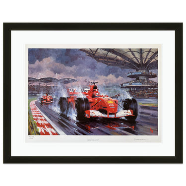 Limited edition print featuring the Ferraris of Michael Schumacher & Rubens Barrichello, who finished in 1st & 2nd place at the 2001 Malaysian Grand Prix.