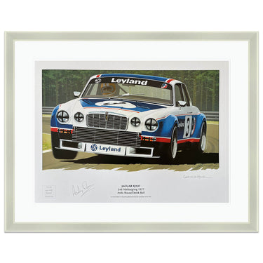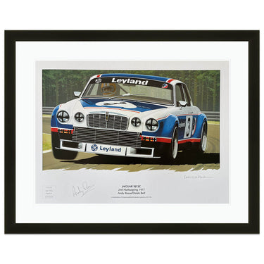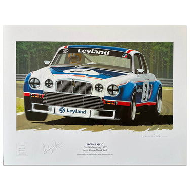 Limited edition print showcasing the second-place Jaguar XJ12C driven by Derek Bell and Andy Rouse during the 1977 European Touring Car Championship (ETCC) event at the Nürburgring.