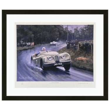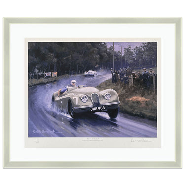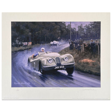 Limited edition print featuring Stirling Moss, who piloted a privately entered Jaguar XK120 to triumph in the 1950 Tourist Trophy, outpacing the works Jaguar team.