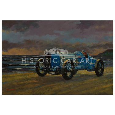 Barry Rowe's painting catches the atmosphere as Malcolm Campbell sets his first Land Speed Record of 146.16mph driving the 350hp Sunbeam 'Blue Bird' on Pendine Sands 25th September 1924.