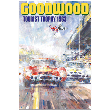 A Pullman Editions poster by Dexter Brown. British Formula 1 World Champion Graham Hill in the winning Maranello Concessionaires Ferrari 250 GTO during Goodwood’s 1963 RAC Tourist Trophy Race. The white 250 GTO of compatriot Mike Parkes alongside. This re-imagined poster is an original design and features artwork by Dexter Brown who illustrated period race posters in the 1960's and 1970's.