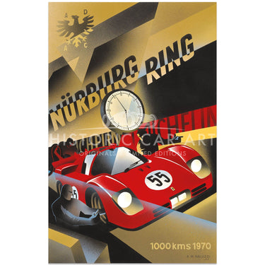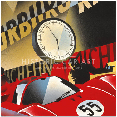 A Pullman Editions poster by Emilio Saluzzi. The ADAC 1000KM-rennen Nürburgring was held in May 1970, on the traditional Northern Loop (Nordschleife) of the Nürburgring. Although it turned out to be Porsche’s day when a 908/03 took victory, the Englishman Mike Parkes, in a Ferrari 512S finished fourth. Parkes was an ex-Ferrari development engineer and reserve driver. The stylised poster by Saluzzi shows the Ferrari 512S during one of many pitstops necessary during an endurance race.