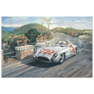 Limited edition print. Driving the fabulous 300SLR Mercedes, 25 year old Stirling Moss scored one of his greatest victories in the gruelling Mille Miglia of 1955.