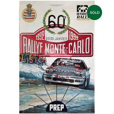 An original poster for the 1992 Monte Carlo Rally. It was won by Didier Auriol driving his Lancia Delta HF.