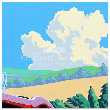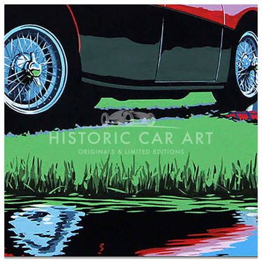 From that start, Brian’s interest has grown into all things of the 1920s-30s period, and of course automobiles, hence a return to one of his first loves. Brian works in two distinct styles, the art deco flat colour image, influenced by the posters and graphics of the 20s-30s period, and a more traditional painterly style, of acrylic on canvas. In either style he likes to capture the way the light shines and reflects on the surface of the vehicle, giving a very solid metallic feel, Brian thinks it is important try and sit the car in a setting appropriate to its era, and style.