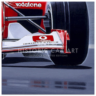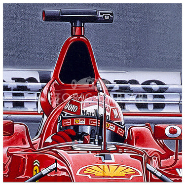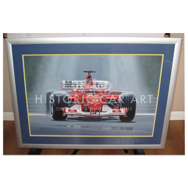 A stunning original painting by Kevin McNicholas of Michael Schumacher highlighting his incredible ‘wet’ driving skills in practice for the 2002 Italian Grand Prix. There are huge ‘rooster tails’ of spray coming from the Ferrari as he drives in monsoon conditions, hence the title ‘Rainman’.