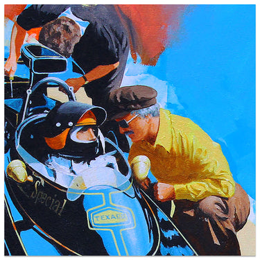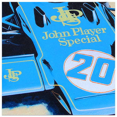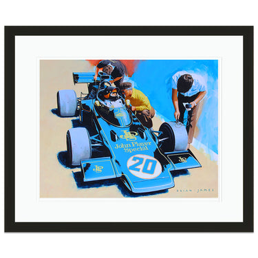 Original artwork by Brian James featuring Emerson Fittipaldi and Colin Chapman with the Lotus 72 at the 1972 Austrian GP.