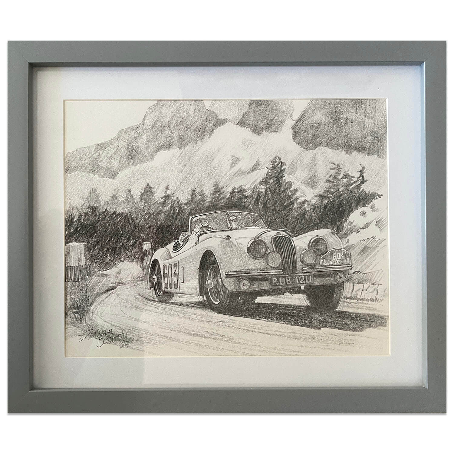 Original pencil drawing of Ian & Pat Appleyard driving their Jaguar XK 120 to win the 1953 Alpine Rally - winning their record 5th Coupe des Alpes.