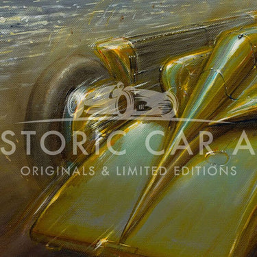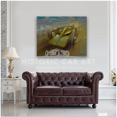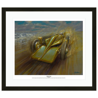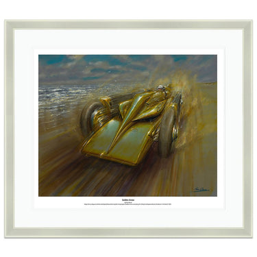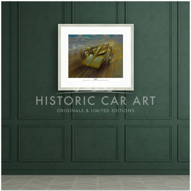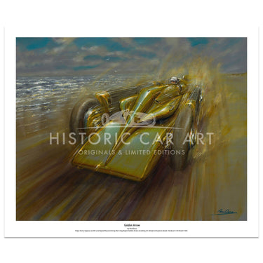 Fine Art print of the Irving Napier Golden Arrow of Henry Segrave pounding along Daytona Beach on 11th March 1929. He is observed by visitors who have come by car to see this spectacle. He achieved a new Land Speed Record that day of 231.45mph.