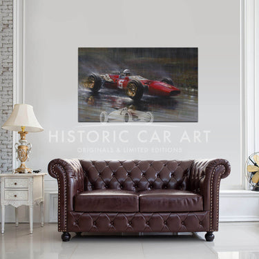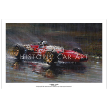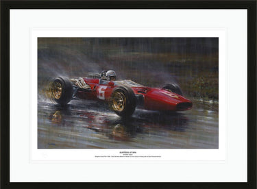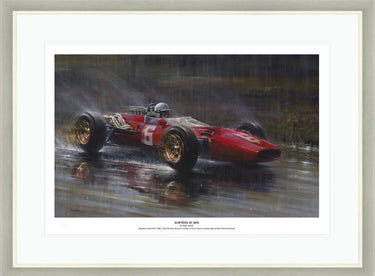This Ferrari art print by Paul Dove captures a very atomospheric scene of F1 legend John Surtees driving his Ferrari 312 to victory in a wet and dangerous Belgian Grand Prix at Spa in 1966.