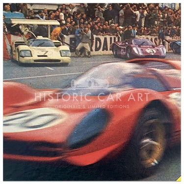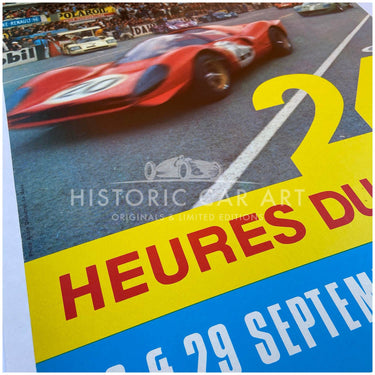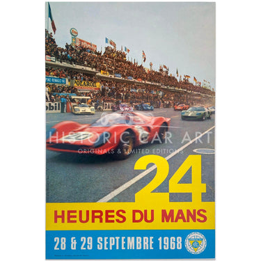 Original vintage poster for the Le Mans 24 hours 1968. The race was rescheduled from it's usual June date to September that year due to civil unrest and strikes in France. The September race poster is more scarce than the June poster - less were printed. Some versions of the September poster were June posters with the date cut off the bottom and the new date over-printed on the top of the poster. The version is the fully printed poster.