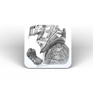 A fantastic pencil portrait by Kevin McNicholas of Max Verstappen on a coaster or art mug.