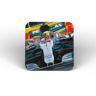A stunning original painting by Kevin McNicholas of Lewis Hamilton driving the Mercedes W08. Now available on a coaster or art mug.