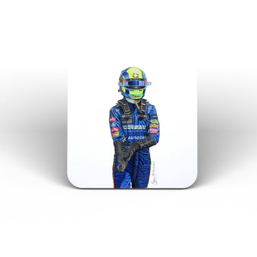 A fantastic coloured pencil portrait by Kevin McNicholas of Lando Norris on a coaster or art mug.