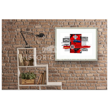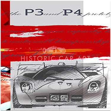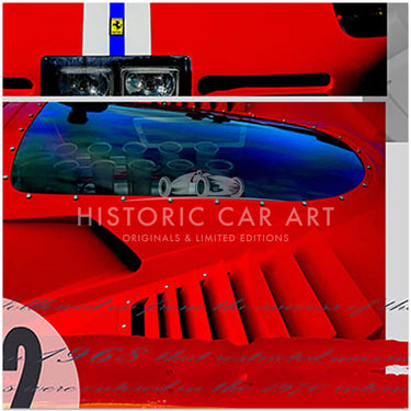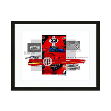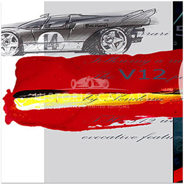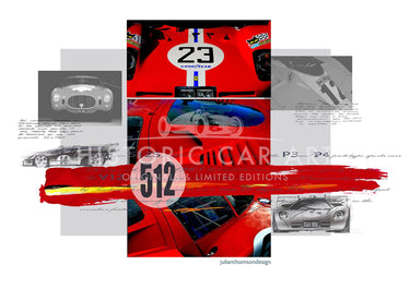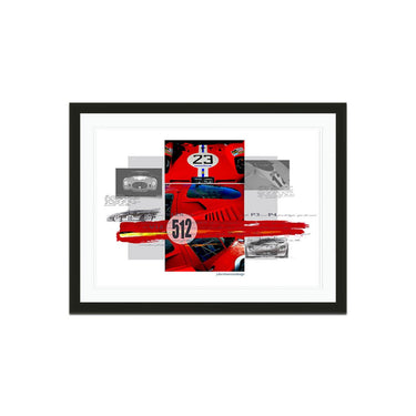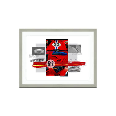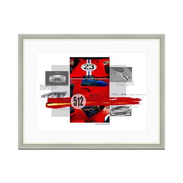Limited Edition Print. A composition artwork of photography, pencil and ink sketches, pencil and digital annotations about the Ferrari 512S.