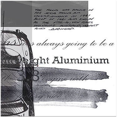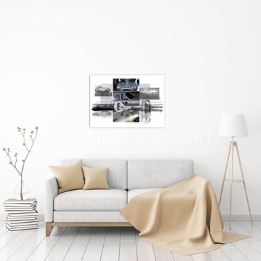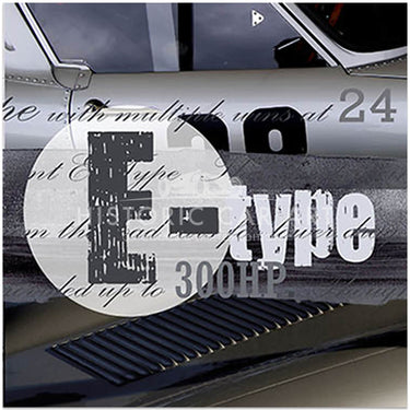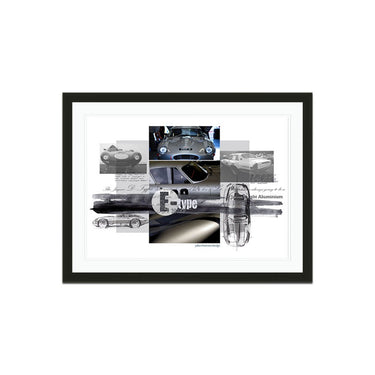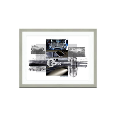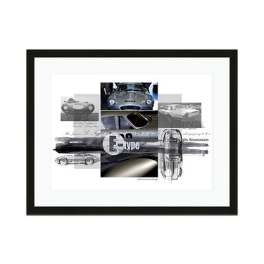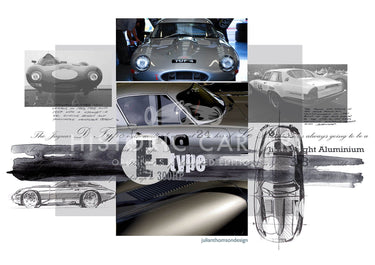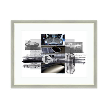 Limited Edition Print. A composition artwork of photography, pencil and ink sketches, pencil and digital annotations about the Jaguar E-type.