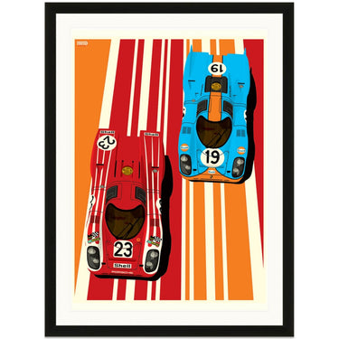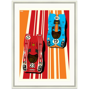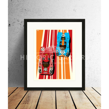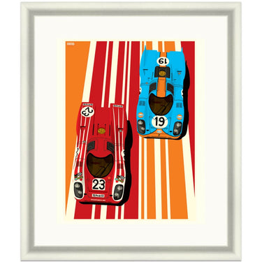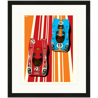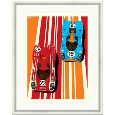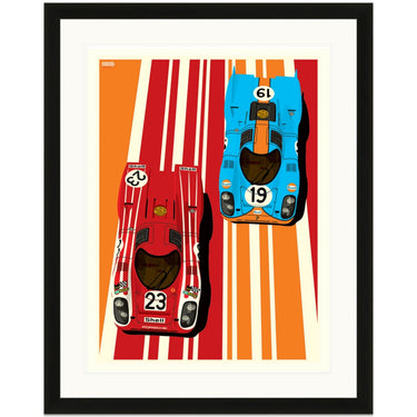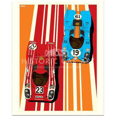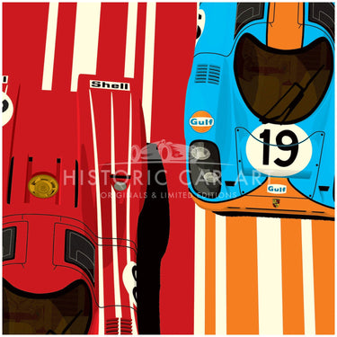 Two of the most iconic Porsche racing liveries are shown off in this colourful graphic art print by Ian Bilbey of the Gulf Oils and Salzburg Porsche 917's as raced the the Le Mans 24 Hours.