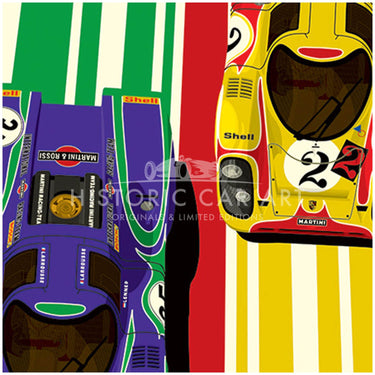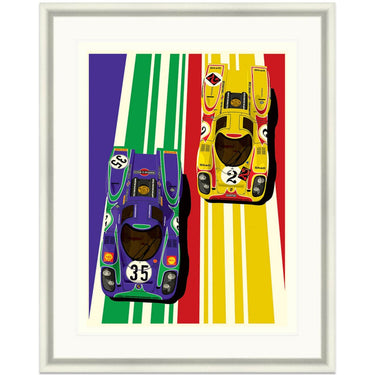 Two of the most iconic Porsche racing liveries are shown off in this colourful graphic art print by Ian Bilbey. The psychedelic (Hippy) Porsche 917K chassis number 917-021 painted in different liveries for different races.
