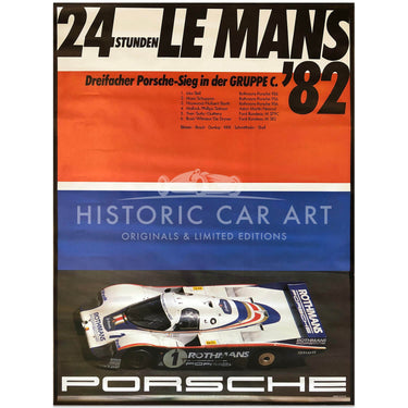 An original Porsche factory victory poster for the 1982 Le Mans. Won by Bell/Ickx in the Porsche 956. German text translates as 'Three-time Porsche victory in Group C'.