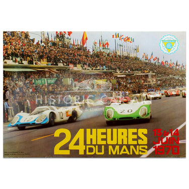 Original vintage poster for the Le Mans 24 hours race 1970. Great photographic image by Andre Delourmel of the Porsche 908 and 917's at the start of the '69 race.