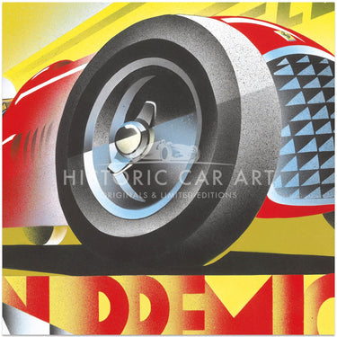Emilio Saluzzi is regarded as one of the most innovative living automobile artists. His dramatic works are reminiscent of the Italian Futurist movement, led by Giacomo Balla (1871-1958) almost a century ago, which paved the way for a generation of Art Deco illustrators. His geometric angular style, coupled with skilful use of airbrush and ‘splatter’, endow his poster artworks with a memorable flourish.